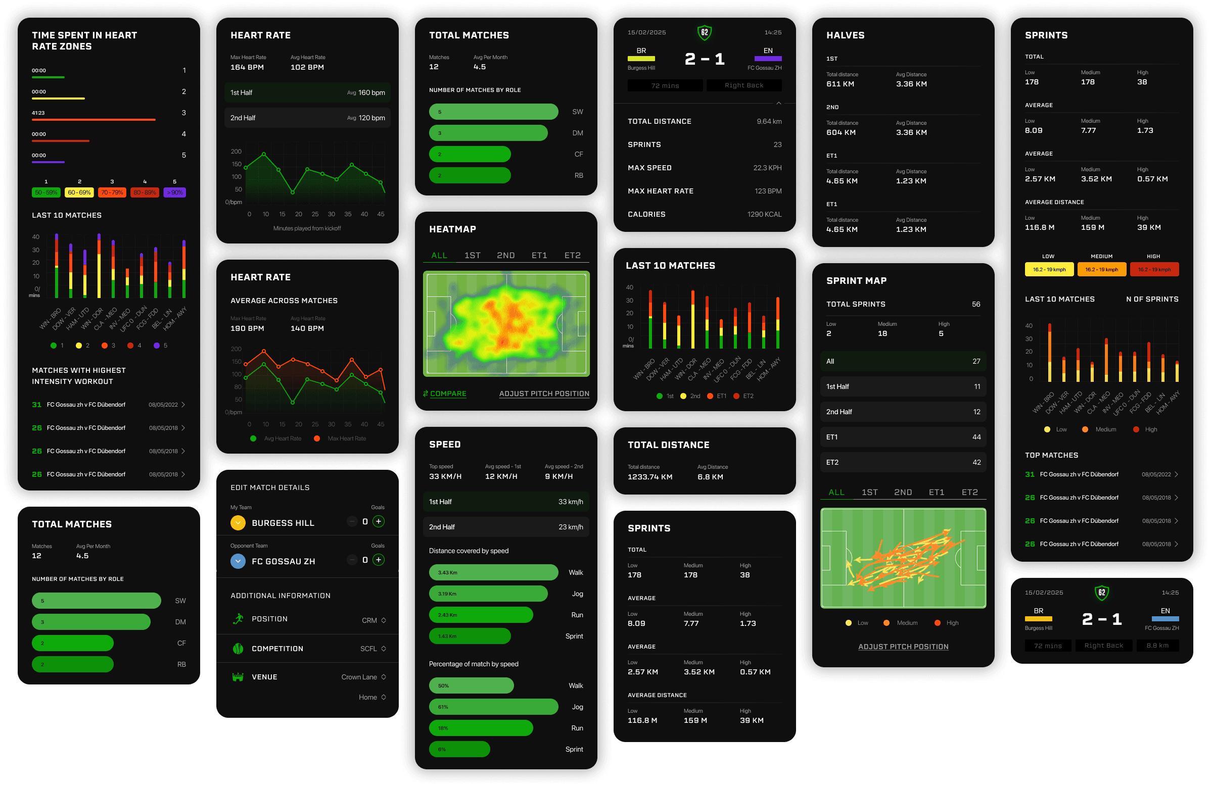 The Scorza App will provide you with a wealth of football specific performance data insights. During matches and training, the system automatically tracks your distance, sprint speed, heart rate zones, and movement patterns using GPS and sensor data. After each session, you get detailed insights including heat maps, sprint maps, heart rate zone analysis and other performance trends to help you understand and improve your game.